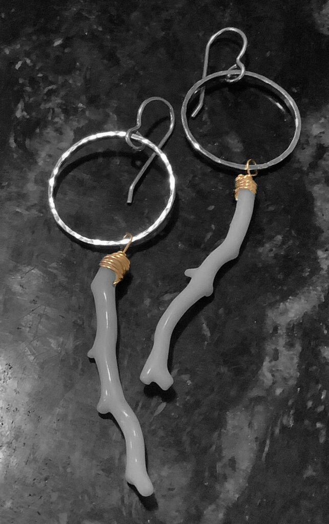 Handmade Sterling Silver Hoops, Natural Coral Branches wrapped in 14K Gold filled Wire