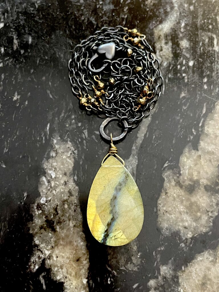 Unique Blue Lightening Strike Natural Labradorite Necklace on Handmade Sterling Link, Patina Sterling Silver Chain, Wrapped with 14k Gold Filled Wire and 14K Gold Filled Beads. Lovely heart clasp on this one! 22 inches Sold