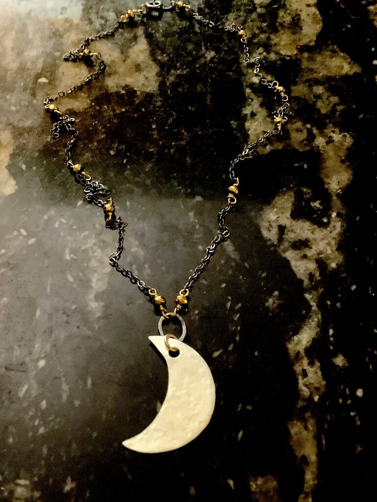 Handmade Sterling Silver Moon on Handmade Sterling Link, Patina Sterling Chain, Finished with Pyrite